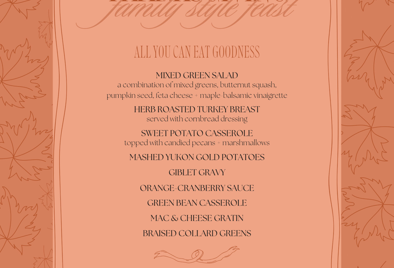 Join us again this year for delicious food and family time! Listed is our menu for this year which will be served family style! Join us at one of our three seatings: 12 PM, 2 PM, or 4 PM! The cost per person is $68 and is all inclusive. A 50% deposit is due at the time of booking to reserve your spot.